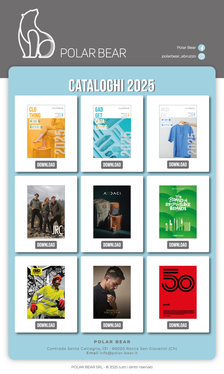 Catalogo Abbigliemento PolarBear - Facebook PolarBear - Instagram Mail Polar Bear Catalogo Gadgets Catalogo Medicale Catalogo JRC Catalogo Aodaci Catalogo Bic Catalogo SIR Catalogo TEEJAYS Catalogo Prodir
